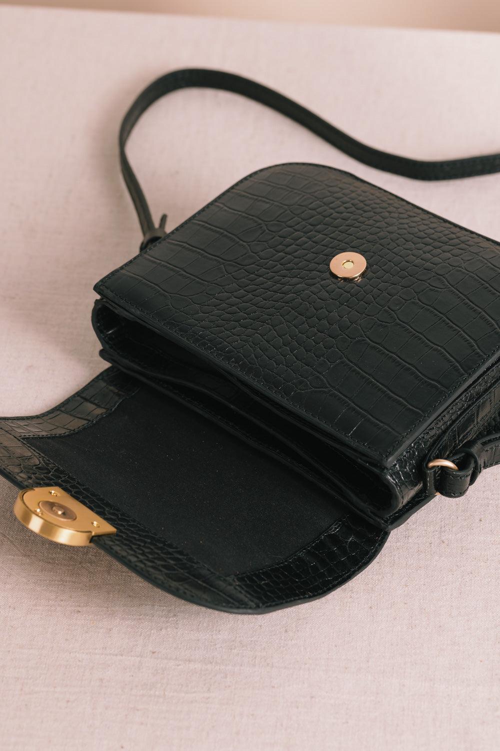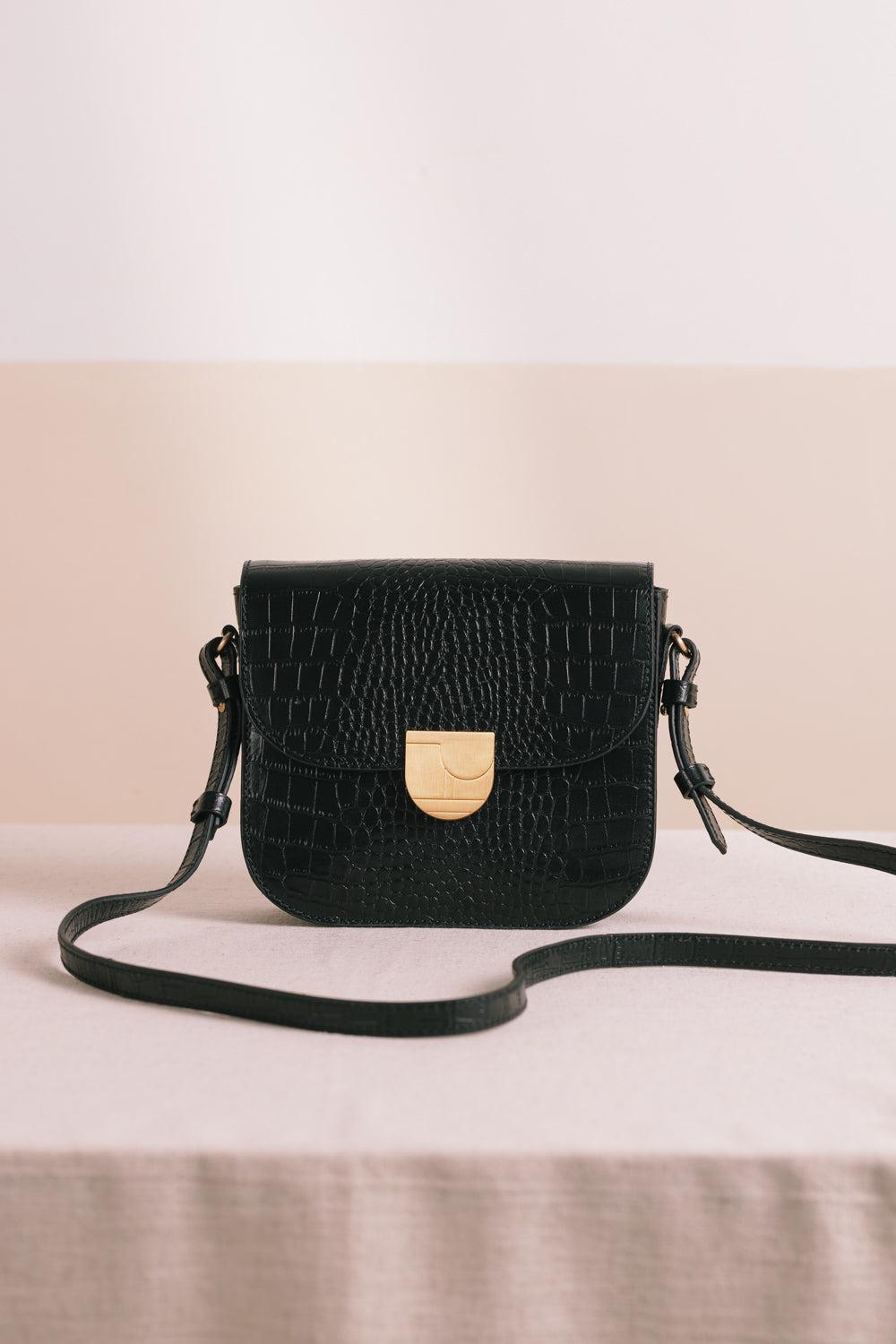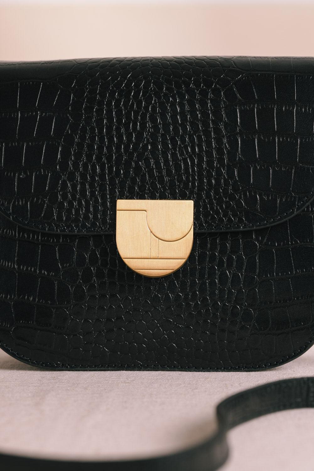 Uma bolsa linda e atemporal para esta estação, a bolsa foi pensada para todos os dias. Mini bolsa retangular com aba em couro preto estampado a quente com efeito crocodilo. Destaca-se pela originalidade do seu fecho em ouro escovado.